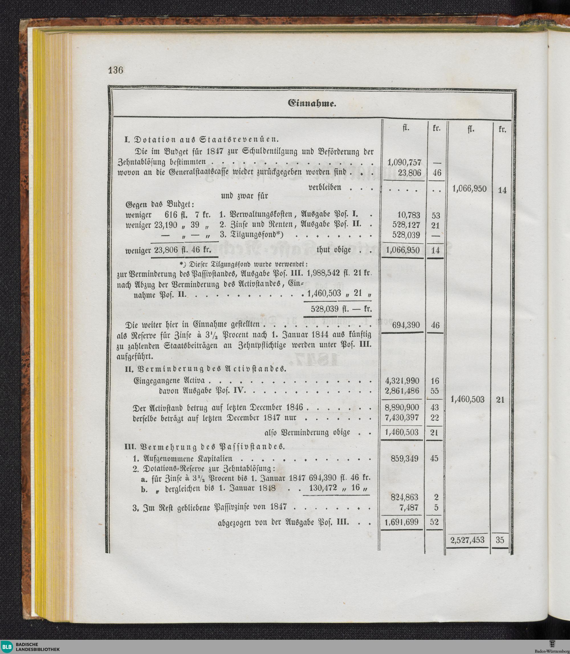 Summarische Darstellung der Amortisations-Kasse-Rechnung für das Jahr 1847