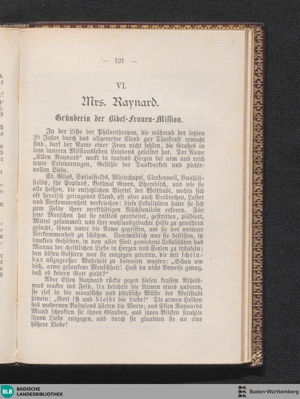VI. Mrs. Raynard. Gründerin der Bibel-Frauen-Mission